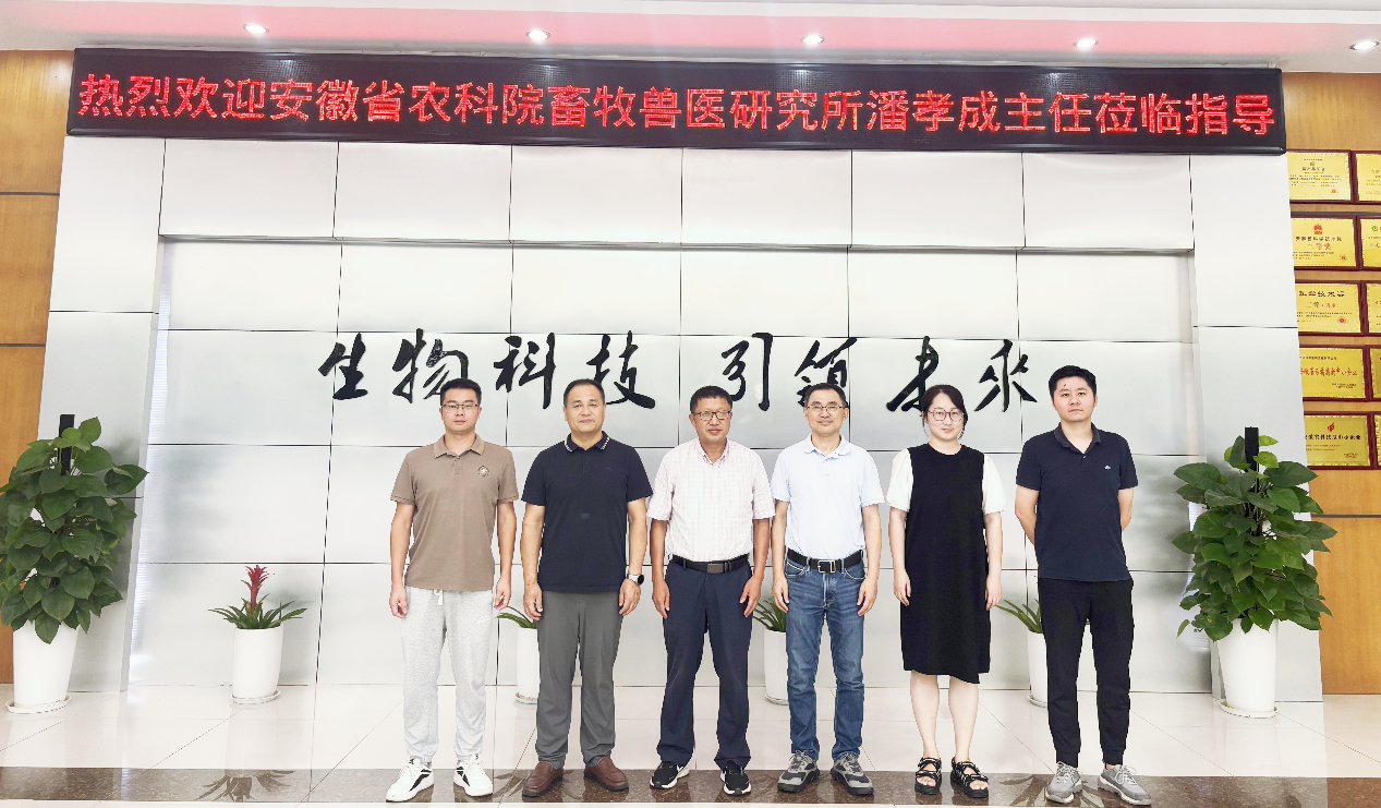 2025年8月12日,安徽省农业科学院畜牧兽医研究所兽医研究室主任潘孝成研究员携团队成员王洁茹、尹磊两位博士莅临合肥迈可罗生物工程有限公司开展技术考察交流活动。公司董事长李晓祥先生热情接待潘孝成研究员团队一行。公司总经理徐自奥和营销总监曹赞共同出席了此次活动。