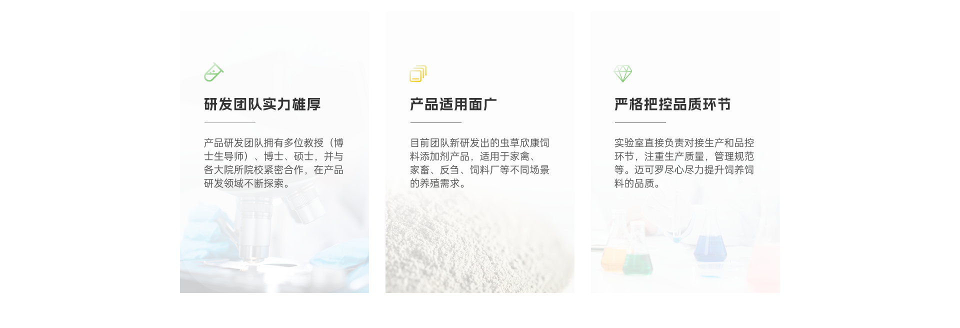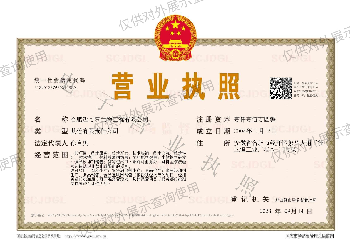 - 合肥迈可罗生物工程有限公司集科、工、贸于一体,以科技为先导的“高新技术企业”、“科技型中小企业”、“规模以上企业”、安徽省“专精特新”中小企业和安徽省饲料行业“优秀科技企业”。 公司研发团队拥有多位教授(博士生导师)、博士、硕士。并聘请了中国农业大学、中国农科院、澳门大学、中国科学技术大学、安徽中医学院和安徽省农科院等院校的多学科专家、教授,形成完备的专家顾问网络。致力于生物技术产品医药、食品、饲料添加剂领域的生产和销售。 -->